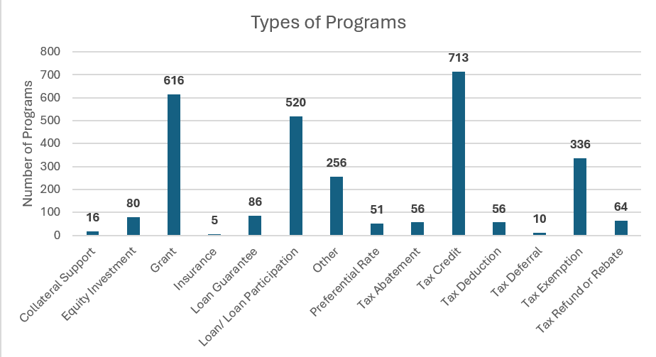 Although the number of incentive programs continues to increase, new incentive program creation has steadily declined over time. As shown in Figure 1, the number of new programs peaked in 2011 and has followed a downward trend since then. While 2025 shows a spike in new programs, the broader trend suggests that states have generally reduced their rollout of new incentive programs. Generally, in response to recessions, states appear to introduce more new incentive programs, For example, in 2020, several states introduced programs to reduce business disruption risks. Such as Maryland’s Manufacturing Disruption Mitigation Assistance Program (MDMAP) and Montana’s Agriculture Adaptability Program.
