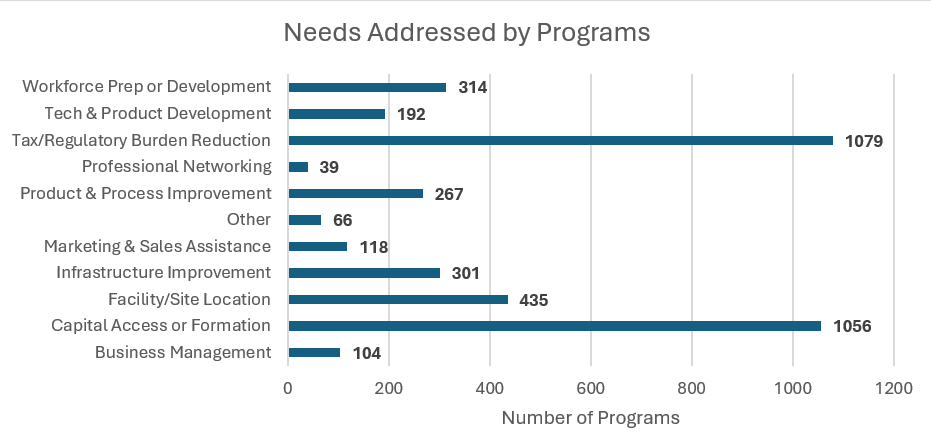 Incentive programs continued to be multifaceted and often address multiple business needs. However, as expected, many focus on enhancing the return on investment (ROI) for business expansion, improving access to capital, and reducing tax or regulatory burdens. Other notable business needs include infrastructure or facility development, product development, and workforce development (Figure 3).