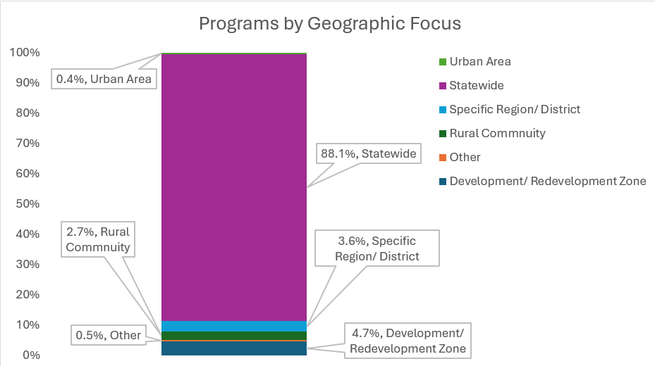 States continue to typically use statewide programs for impacting local and regional economies. The small number of regionally focused incentives are usually in designated development zones, underdeveloped, or rural areas. This trend is consistent with previous updates, showing most programs offer geographically broad economic support.